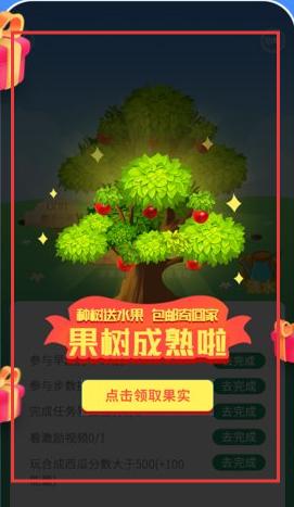 3、进入相关活动页面,看到果树成熟提示。可按要求完成任务,完成后点击【点击领取果实】按钮,有机会获得【包邮寄回家】的水果奖励。