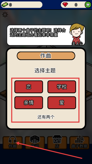 1、在作曲界面,从【恋】【学校】【亲情】【爱】四个主题中,选择两个合适的主题组合来确定作曲方向。