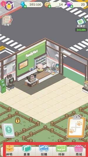 1、在游戏主界面,留意上方资源数值,通过底部菜单栏的【神明】【倉庫】【採購】【待辦】【商城】等功能,管理店铺资源与事务。