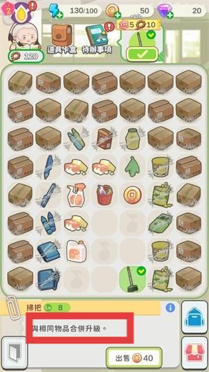 2、在仓库界面,将相同物品合并升级,如把多个【掃把】合并,提升物品等级,多余物品可点击【出售】获取收益。
