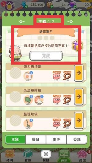 3、依据主线任务要求,按提示使用【強力去漬劑】【菜瓜布妙用】【整理垃圾】等道具或完成对应操作,达成目标后点击【完成】领取奖励。