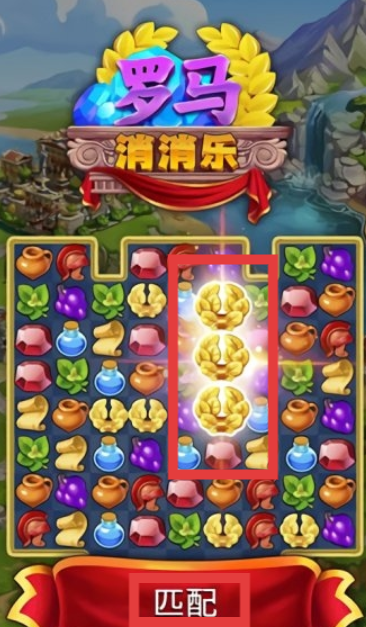 1、在《罗马消消乐》游戏中,通过匹配消除红框内及其他相同图案,获取分数和道具,推进关卡。