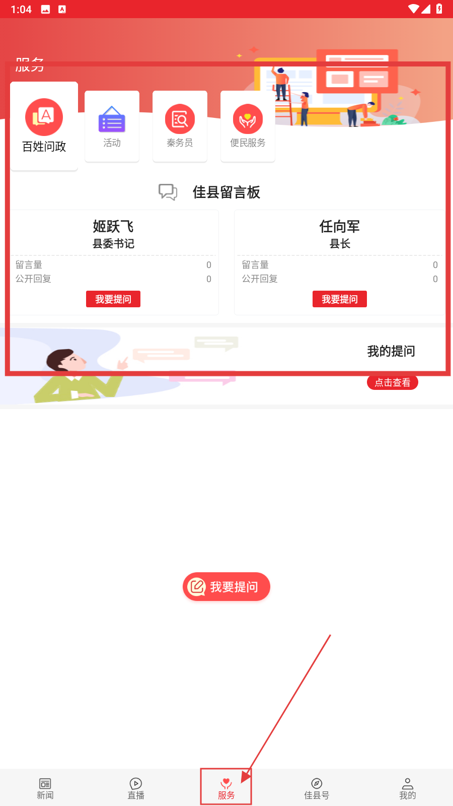 3、点击底部【服务】,通过功能板块获取服务,在【佳县留言板】点击【我要提问】留言。