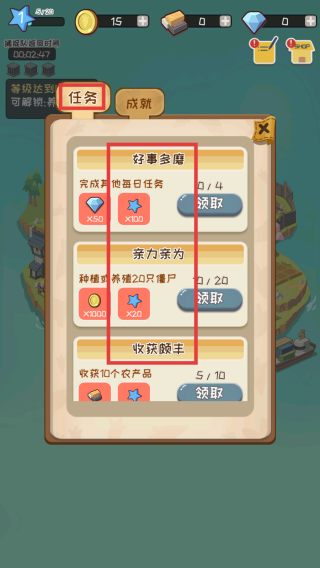 1、在任务界面,按【好事多磨】【亲力亲为】等任务要求,完成相应目标,领取钻石、金币、星星等奖励。