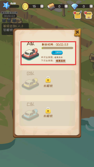 2、关注【A队】捕捉队剩余时间,可等待其完成任务获取资源,也可点击【立即完成】加速进程,后续可解锁【B队】【C队】提升效率。