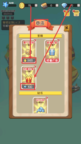 3、在商店界面,依据拥有的金币和钻石数量,按需花费500金币购买【僵尸宝箱】,或花费100钻石购买【惊爆礼盒】,补充游戏资源。