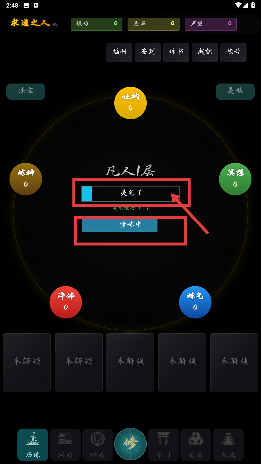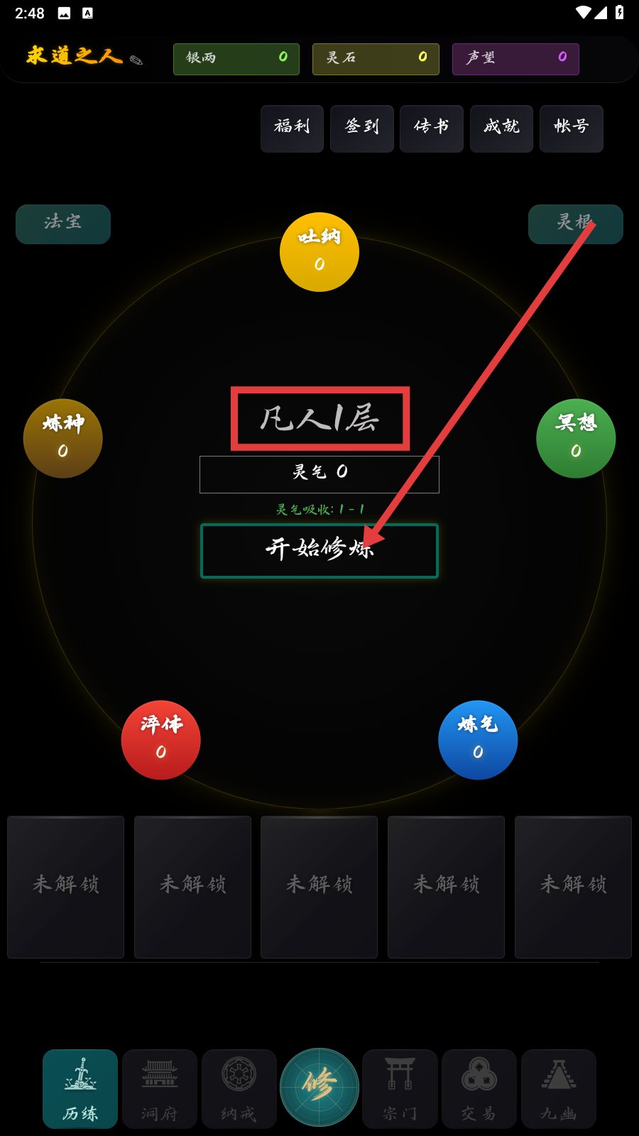 1、在修炼界面,角色处于“凡人1层”,灵气值为0,灵气吸收为1-1。点击【开始修炼】,开始积累灵气,提升修炼进度。