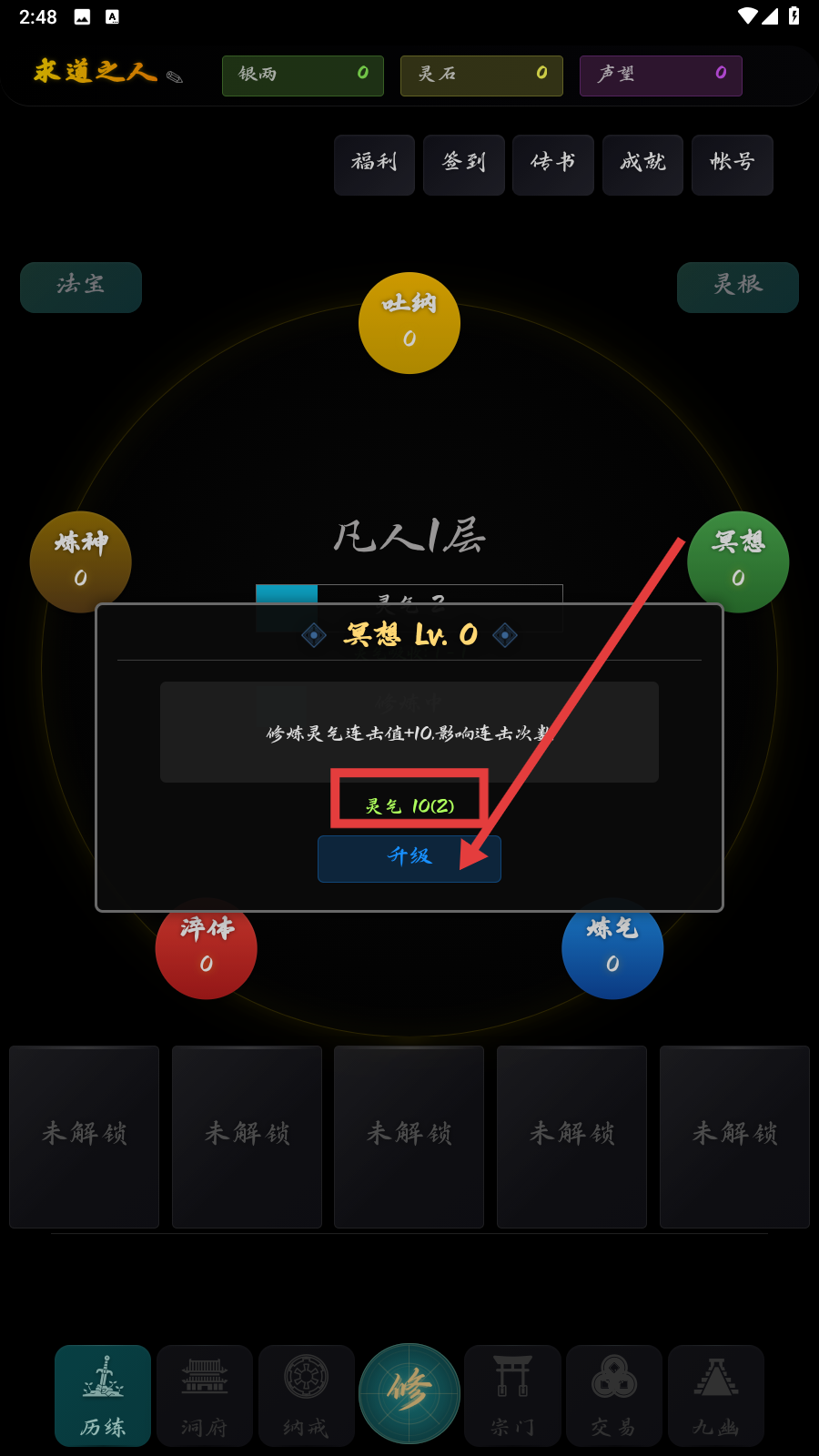 3、以“冥想”为例,修炼灵气连击值+10,影响连击次数。若灵气值满足条件(如10(2)),点击【升级】提升技能等级,增强修炼效果。