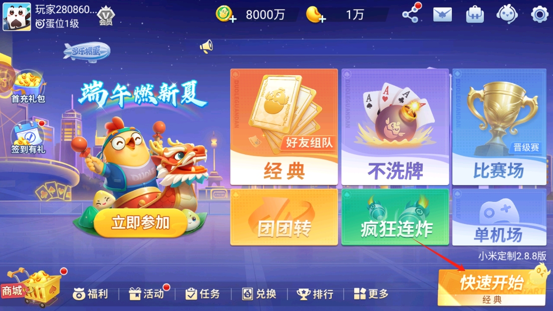 3、在游戏大厅中,点击“快速开始”按钮选择游戏模式。提供多种模式选择,根据喜好选择经典或比赛场开始游戏。