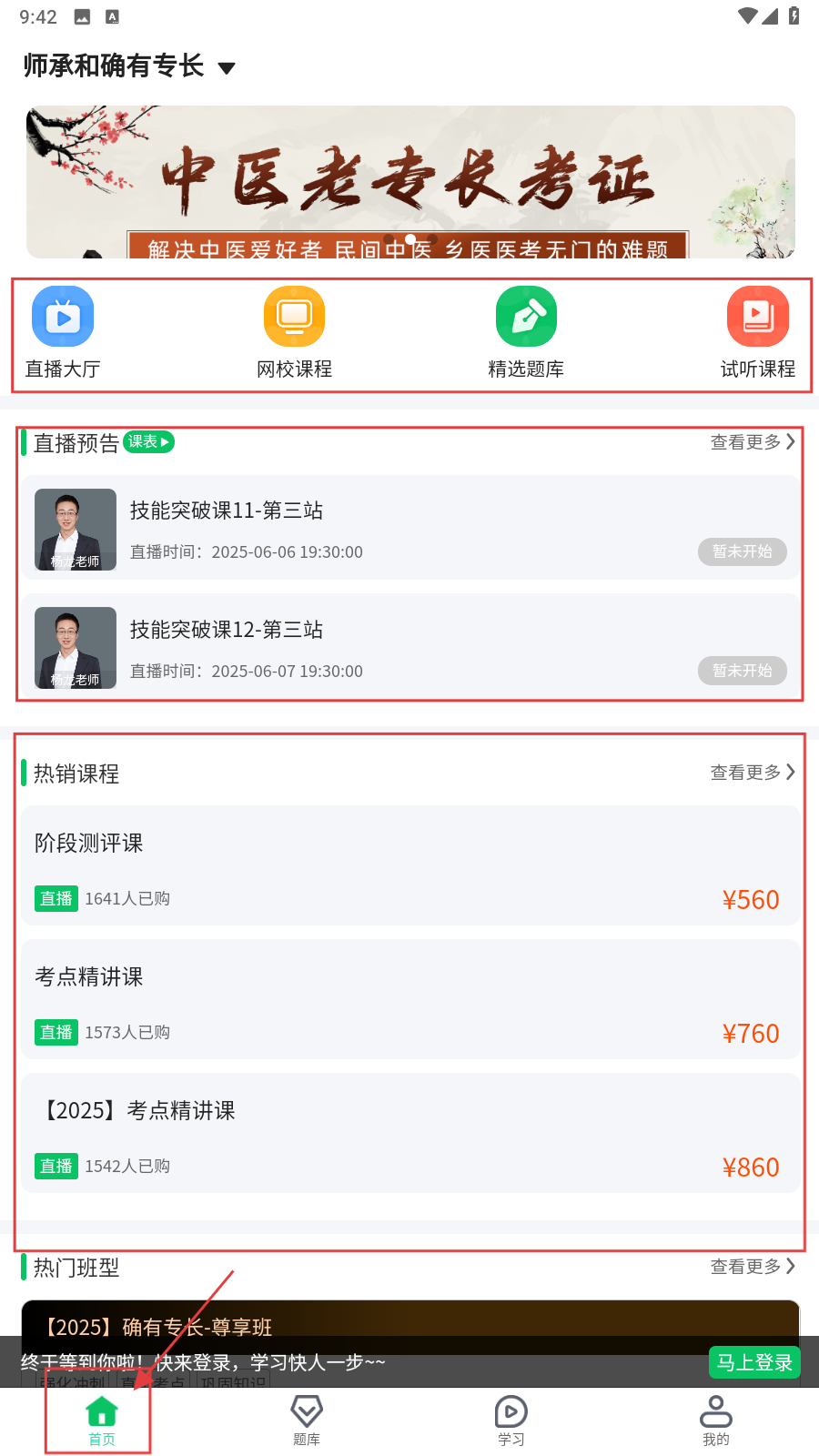 1、打开应用进入首页,点击【直播大厅】看直播,或选【网校课程】【试听课程】学习。