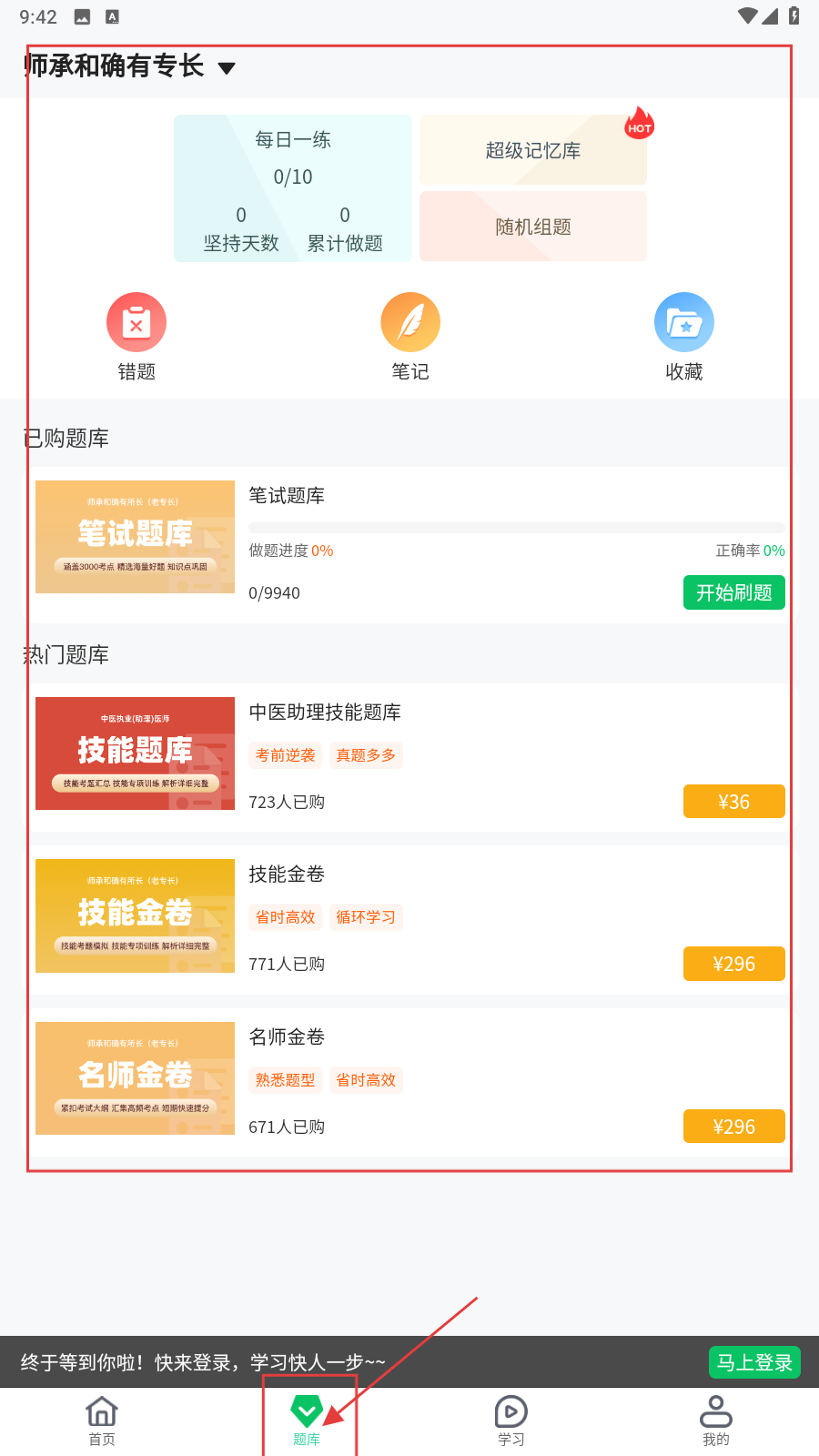 2、点击底部【题库】,在界面通过【每日一练】练习,在【已购题库】点【开始刷题】做题,选购【热门题库】。