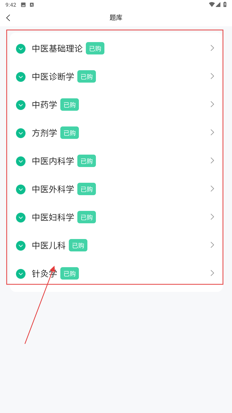 3、在【题库】界面,点击已购的【中医基础理论】【中医诊断学】等科目,进入刷题学习。