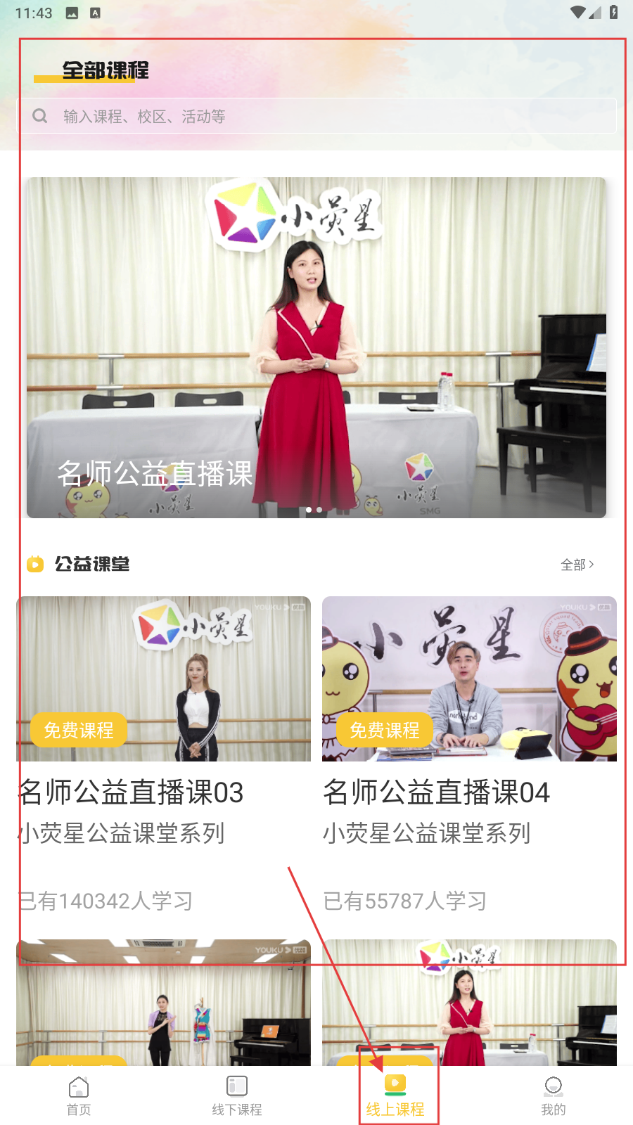1、打开应用,点击底部【线上课程】按钮,在【全部课程】界面,可通过搜索框查找课程,或选择【名师公益直播课】等免费课程进行学习。