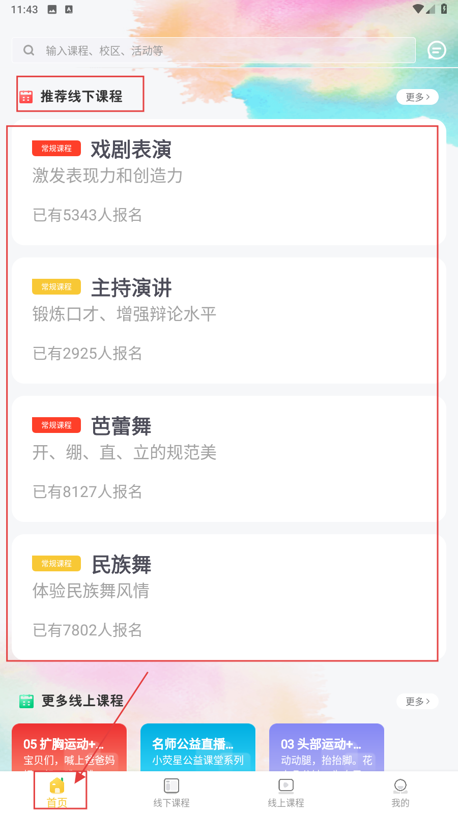 2、点击底部【首页】按钮,在【推荐线下课程】板块,查看【戏剧表演】【主持演讲】等线下课程介绍及报名人数,按需选择课程。