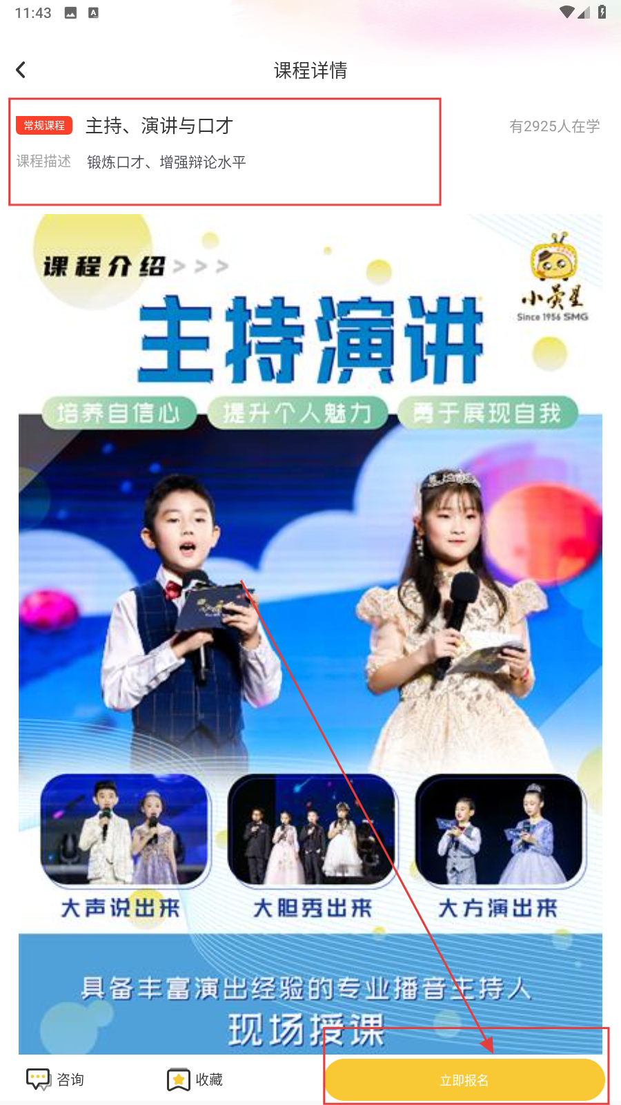 3、在课程详情页面,了解【主持、演讲与口才】等课程信息后,点击【立即报名】按钮,按提示完成报名流程。