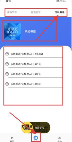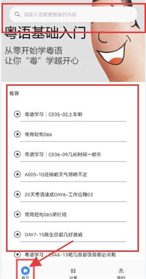 2、点击底部【分类】按钮,切换到【玩转粤语】板块,选择课程,开启粤语学习之旅。