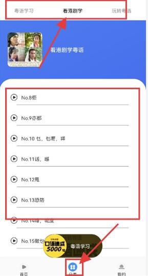 3、在【分类】界面,切换到【看港剧学】板块,点击课程,通过港剧相关内容学习粤语。