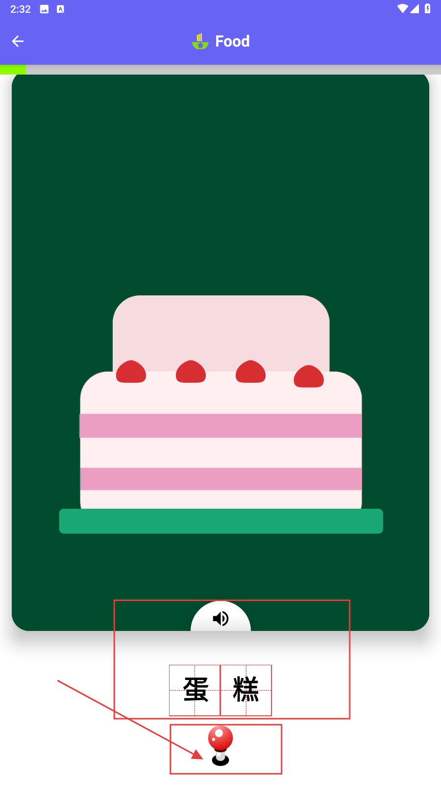 2、在【Food】界面,点击蛋糕图案下方的喇叭图标,可听取“cake”的英文发音,拖动红色圆点,可进行切换到中文界面。