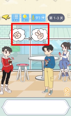 2、关卡【第1-3关】,留意人物头上的手势思考气泡,可能是解谜线索,通过分析手势含义寻找过关方法。