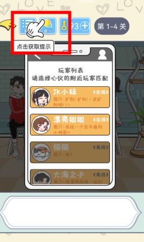 3、关卡【第1-4关】,根据提示【点击获取提示】,点击对应按钮获取线索,从【玩家列表】中选择合适玩家匹配,完成关卡任务。