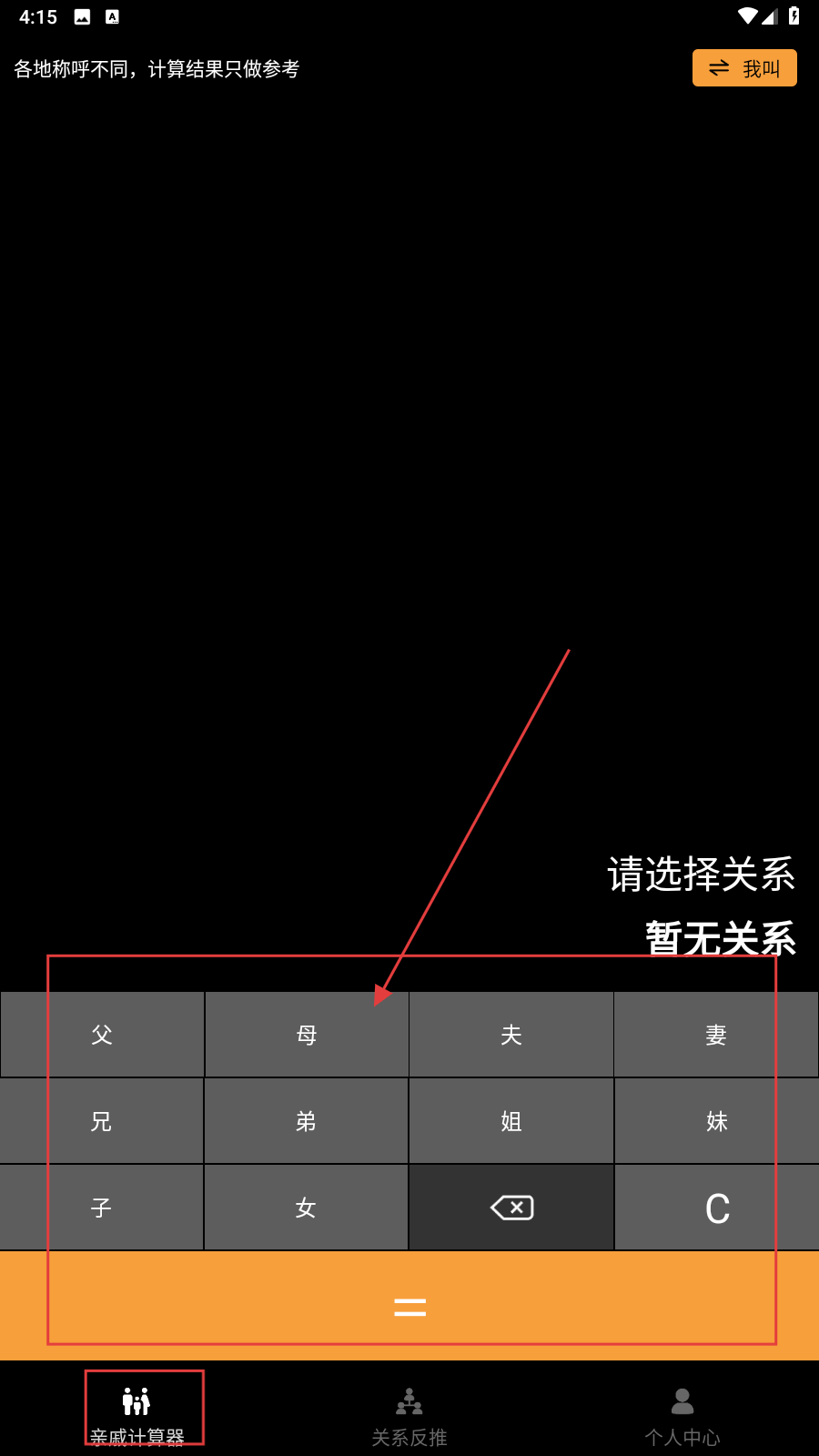 1、打开亲戚计算器应用,点击底部【亲戚计算器】,进入亲戚关系计算界面,在按键区选择相关亲属关系按键。