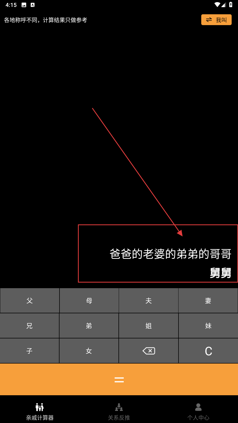 2、按顺序选择按键输入亲戚关系,如依次选择对应“爸爸”“老婆”“弟弟”“哥哥”的按键,点击【=】得出称呼为【舅舅】。