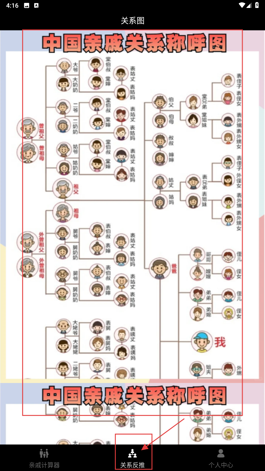 3、点击底部【关系反推】,可查看【中国亲戚关系称呼图】,辅助了解亲戚关系。