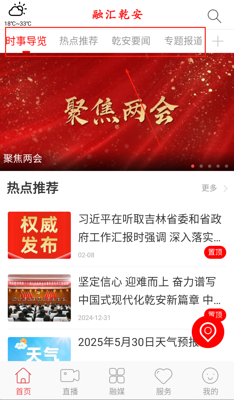 2、启动应用后进入主界面,可左右滑动切换省内新闻、乾安要闻等分类频道,自由选择图文报道或直播内容深入阅读。