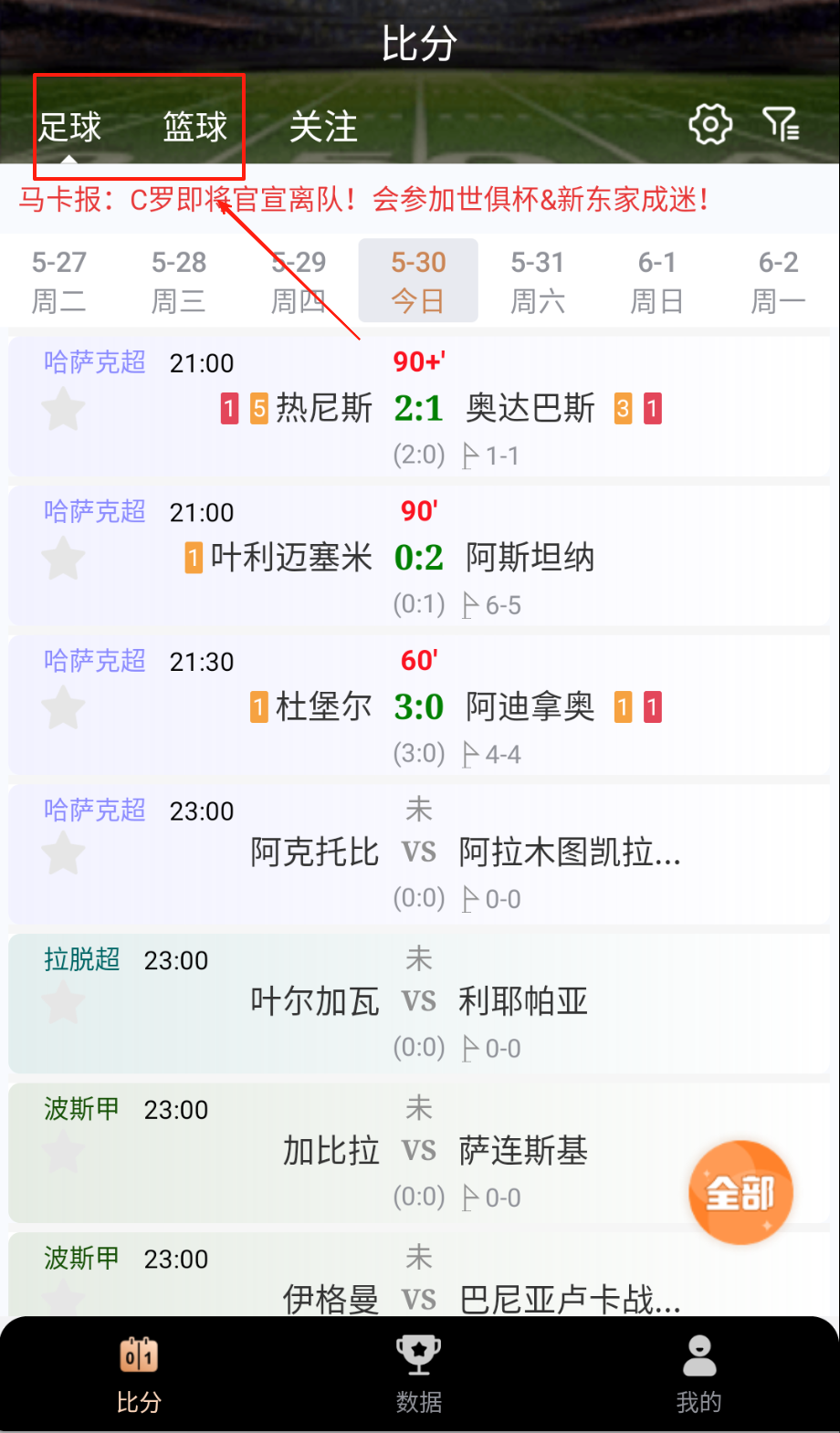 1、 启动应用后选择足球或篮球赛事类型,查看实时比分进展与进球详情,快速了解比赛状态。