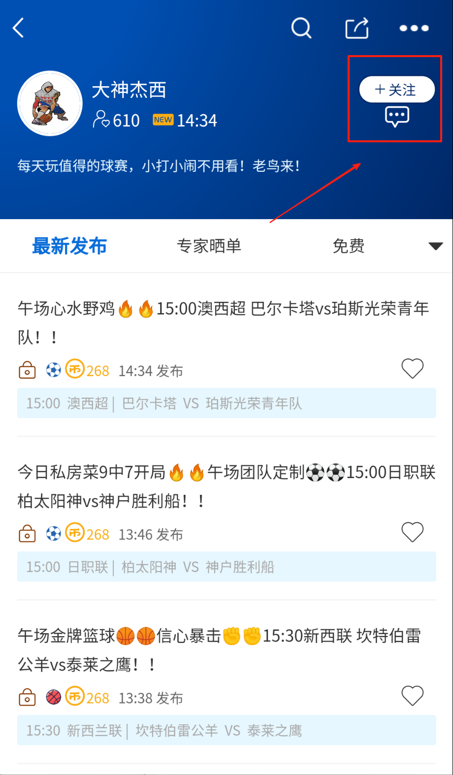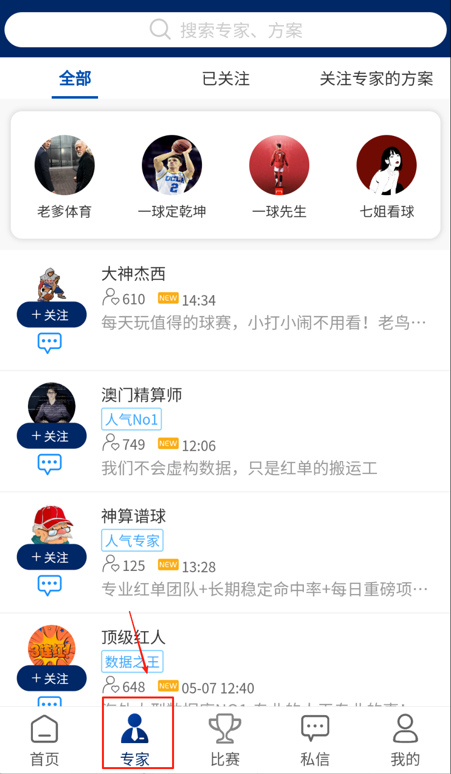 2、浏览各类体育赛事信息,根据兴趣关注专家大咖,同时接收分析预测方案。