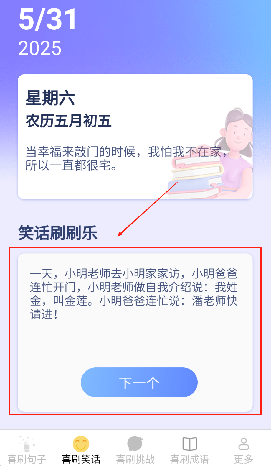 开心喜刷以一站式服务整合句子笑话挑战成语等趣味内容,提供正能量娱乐体验,帮助用户放松压力锻炼思维,寓教于乐学习知识,丰富日常生活,免费无限制设计让使用更便捷,整体提升个人认知和生活品质。
