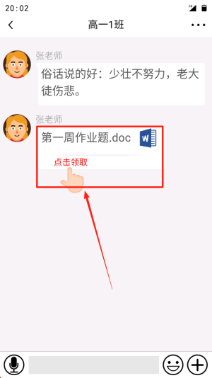3、领取作业文件:在模拟的聊天界面中,点击老师发送的作业文件链接,下载并查看作业内容。