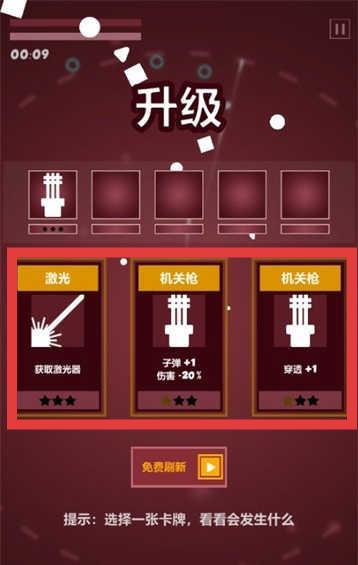 2、升级时会出现不同卡牌选项,像【激光】【机关枪】等,选择卡牌会带来不同效果,合理抉择卡牌能优化战斗策略。