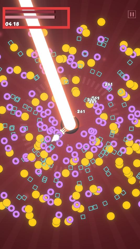 3、战斗中留意左上角的【进度条】,把握战斗节奏,利用武器如激光等,快速清除如黄色、紫色圆形和方形等敌人,获取战斗胜利。
