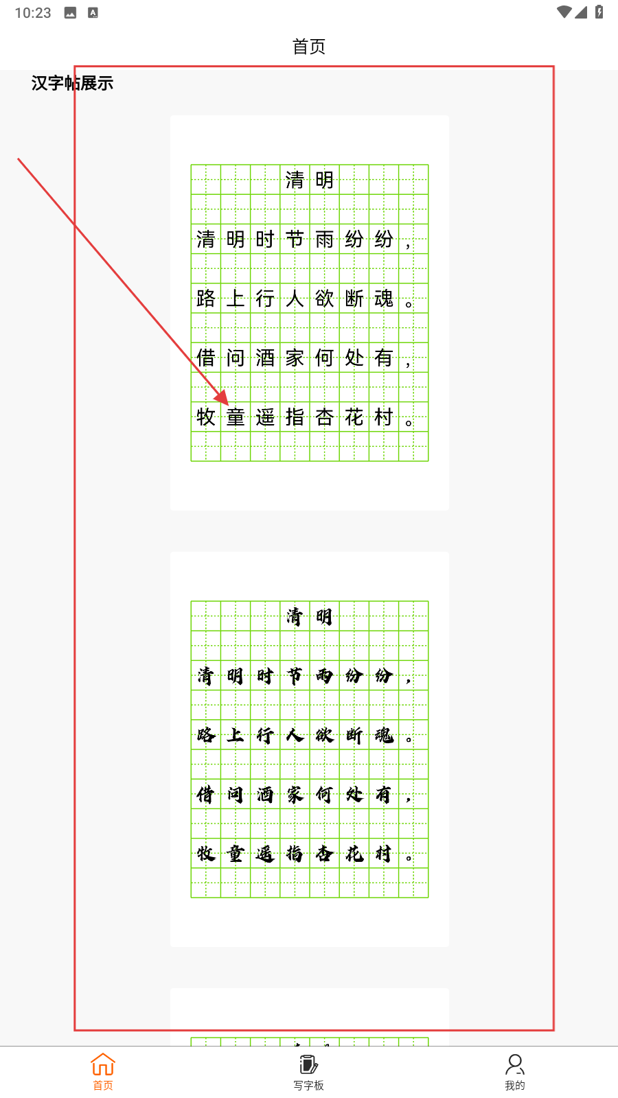 1、打开字帖应用,进入【首页】,查看【汉字帖展示】中已有的字帖内容,如《清明》诗句字帖,了解字帖格式和字体呈现效果。