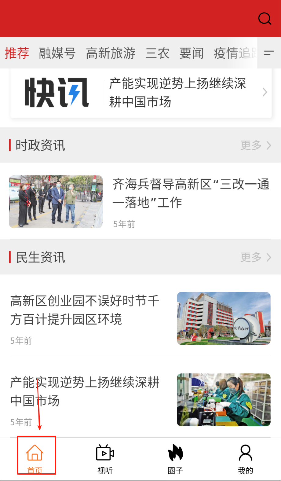 1、点击旅游、三农、要闻或疫情追踪频道,查看专题报道,获取高新区最新动态。