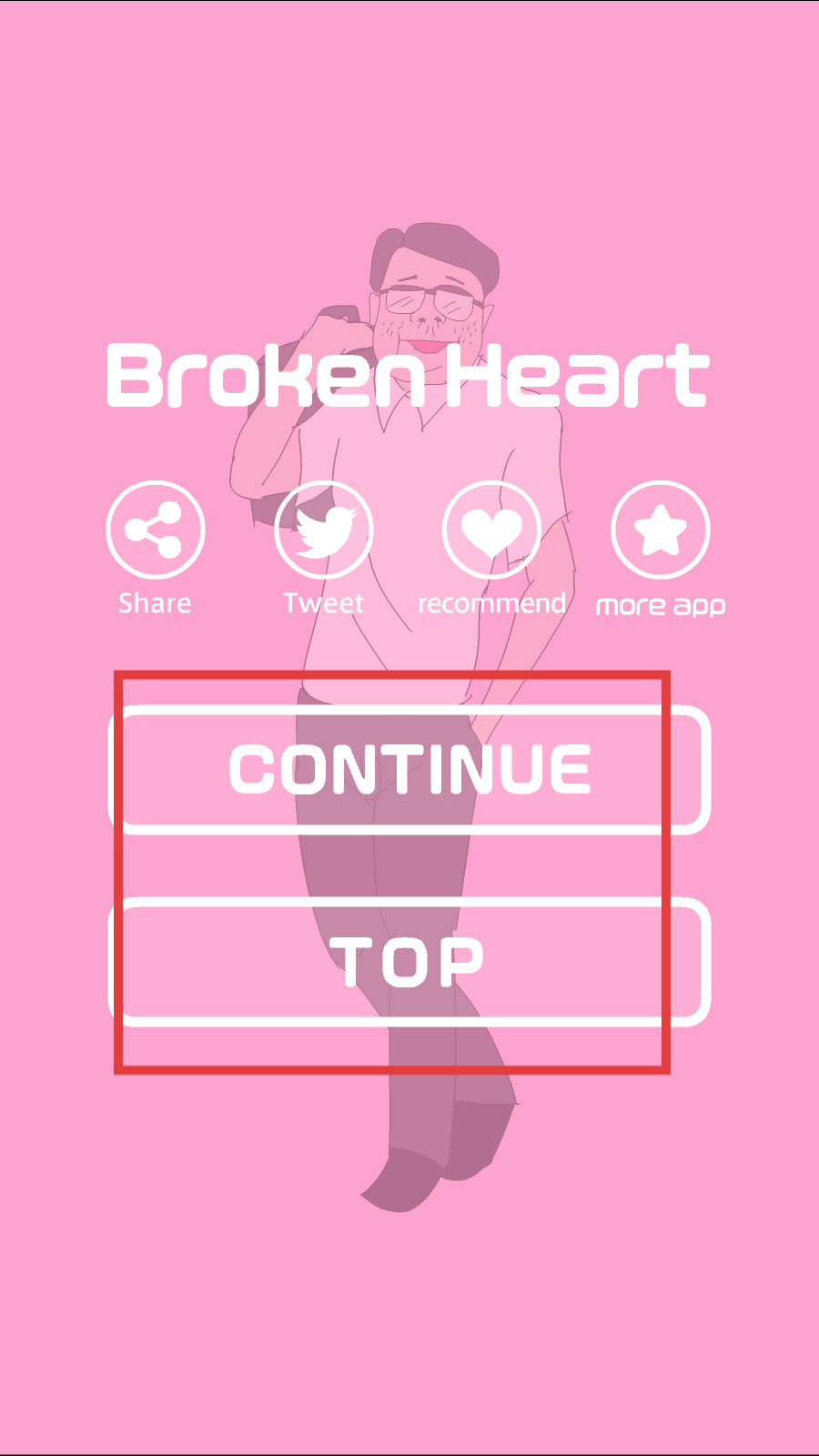 3、游戏结束后,在【BrokenHeart】界面,可通过点击【CONTINUE】继续游戏,或点击【TOP】返回顶部菜单进行其他操作。