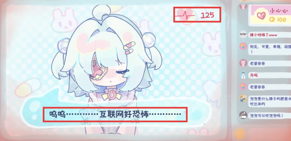 2、当出现负面弹幕导致角色发出【呜呜、互联网好恐怖】等反馈,且心率上升(如到【125】)时,需重视并采取措施应对网络恶意。