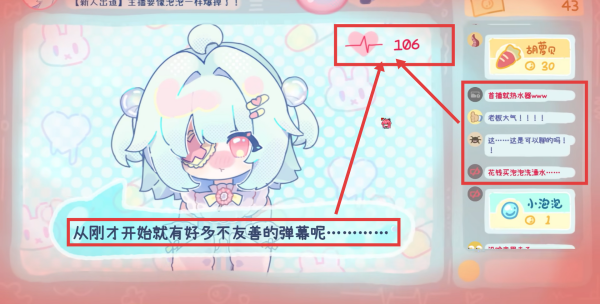 3、关注弹幕内容,面对不友善弹幕使心率达【106】等情况,可通过互动功能(如小沧兎)引导正向言论,维护直播氛围。