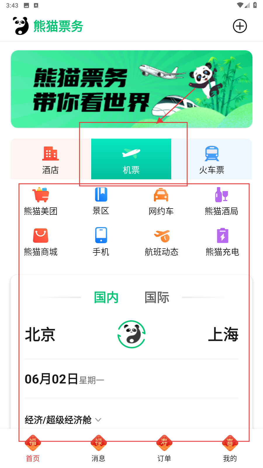 1、打开应用,点击首页【机票】,选择【国内】或【国际】行程,输入出发地、目的地、日期及舱位,查询并预订航班。