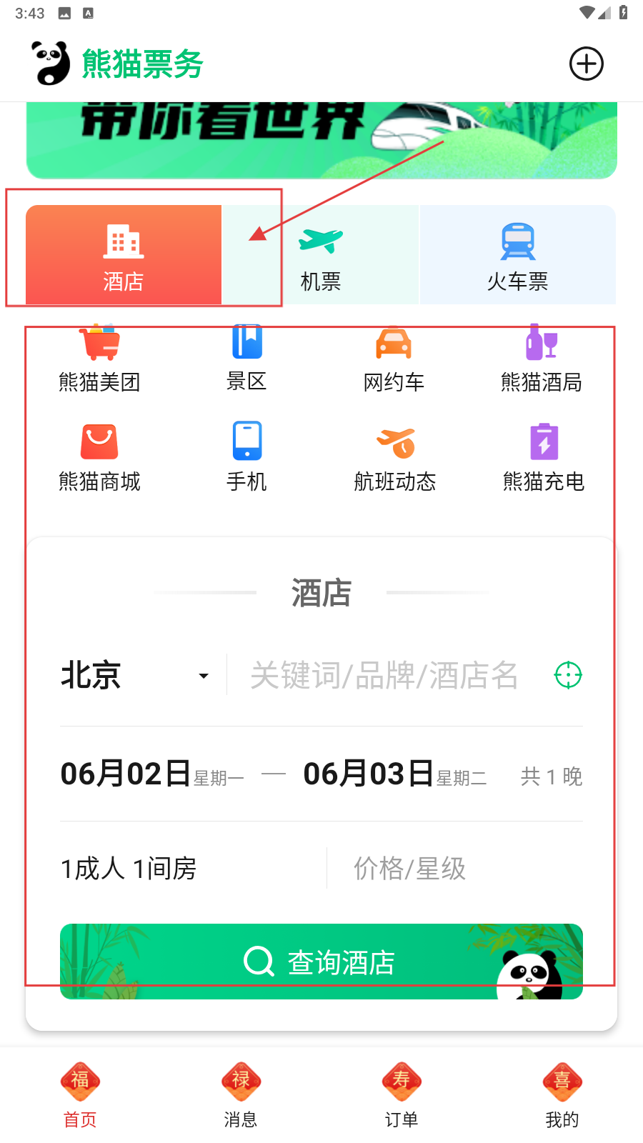2、点击【酒店】,选定入住城市、日期、人数,可按【价格/星级】筛选,点击【查询酒店】后挑选房型并完成预订。
