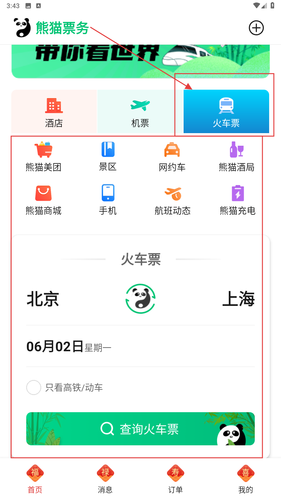 3、点击【火车票】,输入出发地、目的地、日期,勾选【只看高铁/动车】筛选车次,选择席位后提交订单。