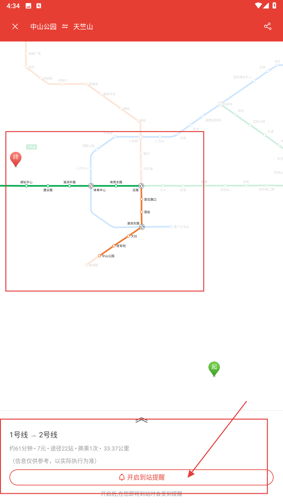3、输入完成后,页面会显示从起始站到终点站的线路规划,包括换乘信息、预计耗时、费用、途经站点数等,还可点击【开启到站提醒】。
