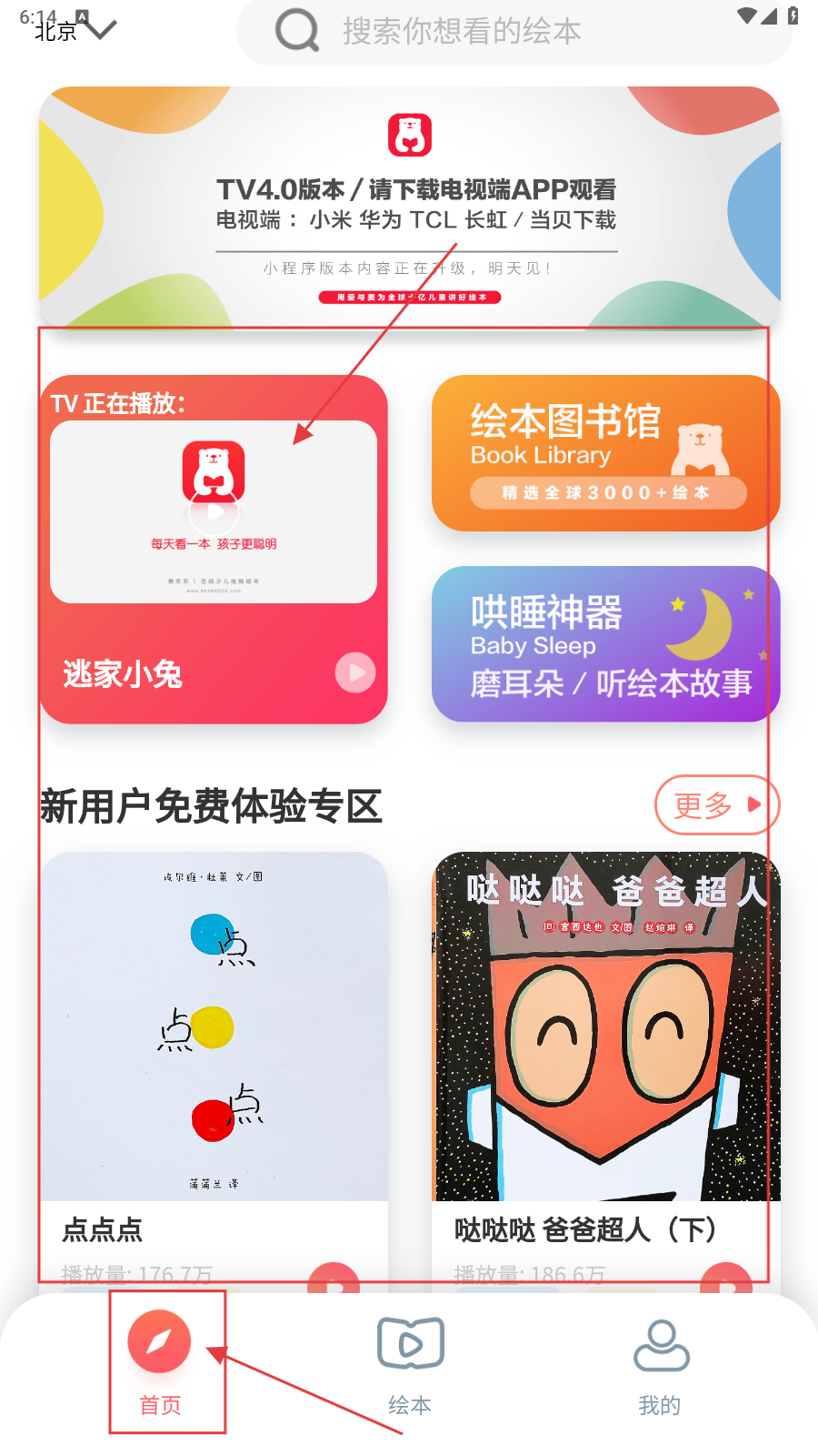 1、打开应用,进入【首页】,在【新用户免费体验专区】找到《点点点》绘本并点击。