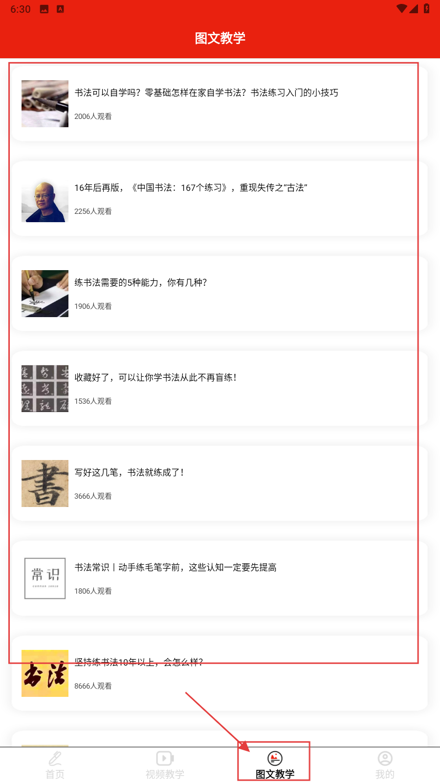 3、点击底部导航栏的【图文教学】,可查看书法学习相关文章,获取书法练习技巧和知识。