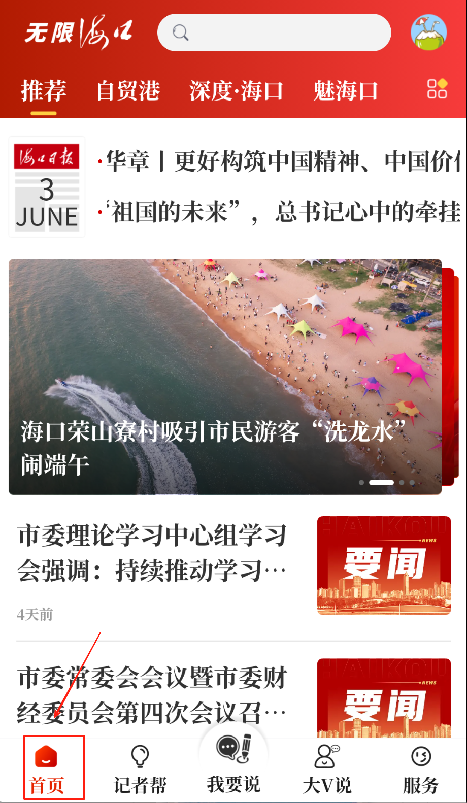 1、首页栏目导航涵盖推荐、自贸港、时事等板块,滑动浏览即可掌握海口最新动态与深度报道。