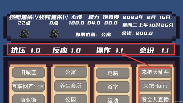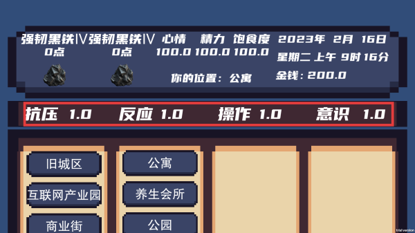 1、游戏开始时,关注角色属性,如【抗压】【反应】【操作】【意识】初始值为1.0,这些属性会影响后续发展。