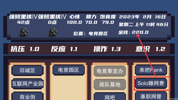 3、选择【Solo赚网费】等任务,能增加金钱收益(如从200.0增加到220.0),合理安排活动提升角色能力和经济状况。