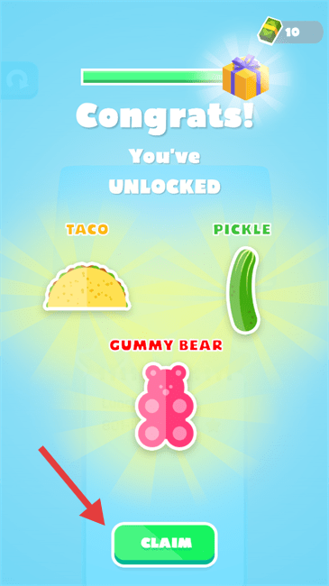 1、解锁【TACO】【PICKLE】【GUMMY-BEAR】后,点击【CLAIM】领取奖励,这些物品可用于后续食物搭配关卡。