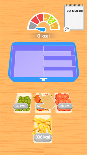 2、在食物搭配界面,选择【30-kcal】【6-kcal】【20-kcal】【336-kcal】等食物,放入饭盒,计算总热量,尝试接近目标范围(如801-1000 kcal),练习热量组合。